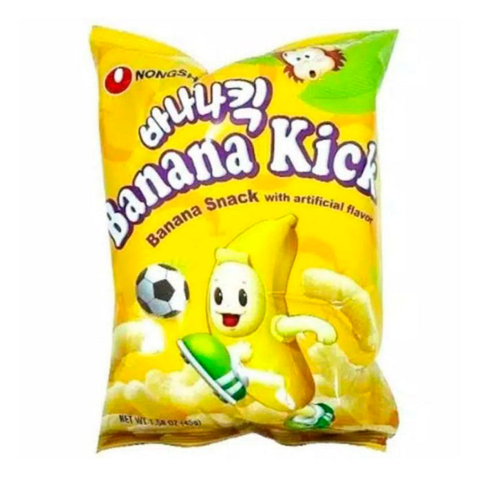 Banana Kick un snack coreano dulce con sabor a banana. Disfruta de estos suaves y crocantes snacks coreanos