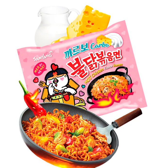 BULDAK Ramen coreano muy popular de fideos sabor a pollo muy picante con el clasico sabor de la salsa carbonara.
