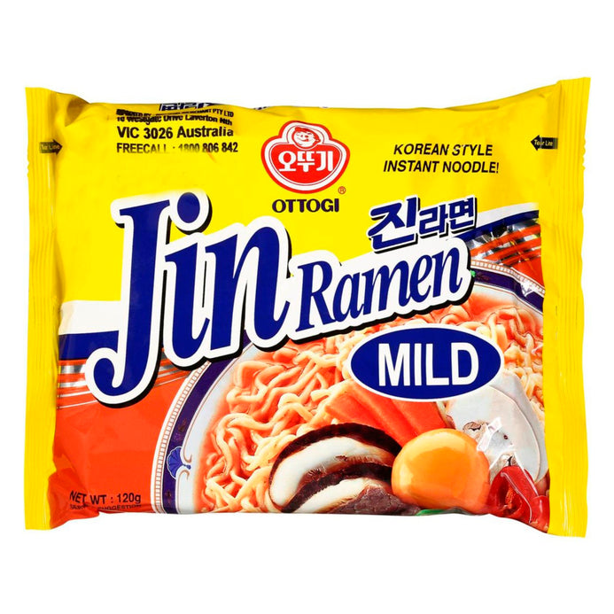Jin Ramen Mild ramyun coreano de Ottogi. El caldo tiene un profundo y delicioso sabor a res que se complementa perfectamente con el sabor de los fideos. Además contiene trozos de vegetales. Tiene un nivel de picante medio