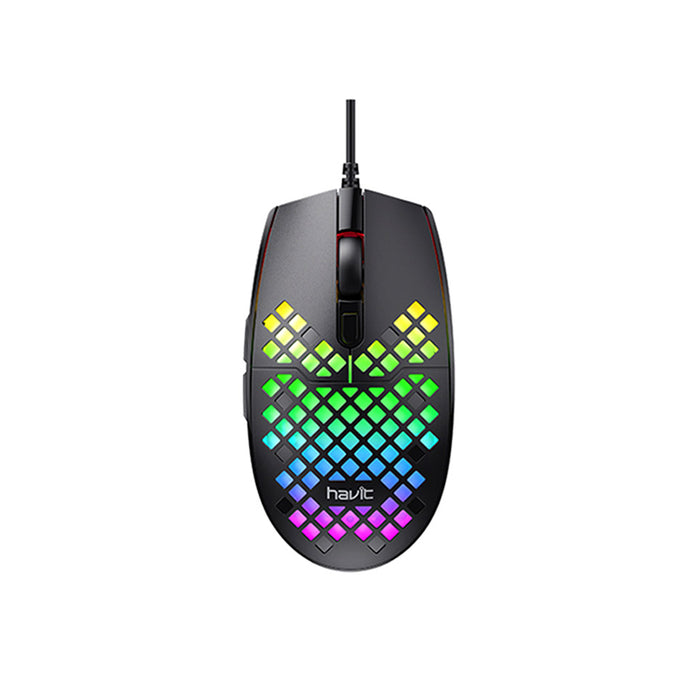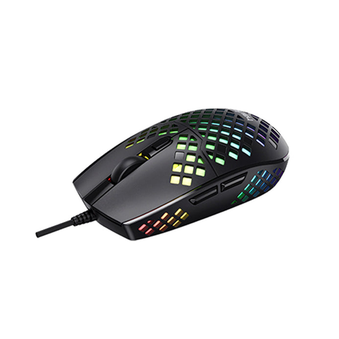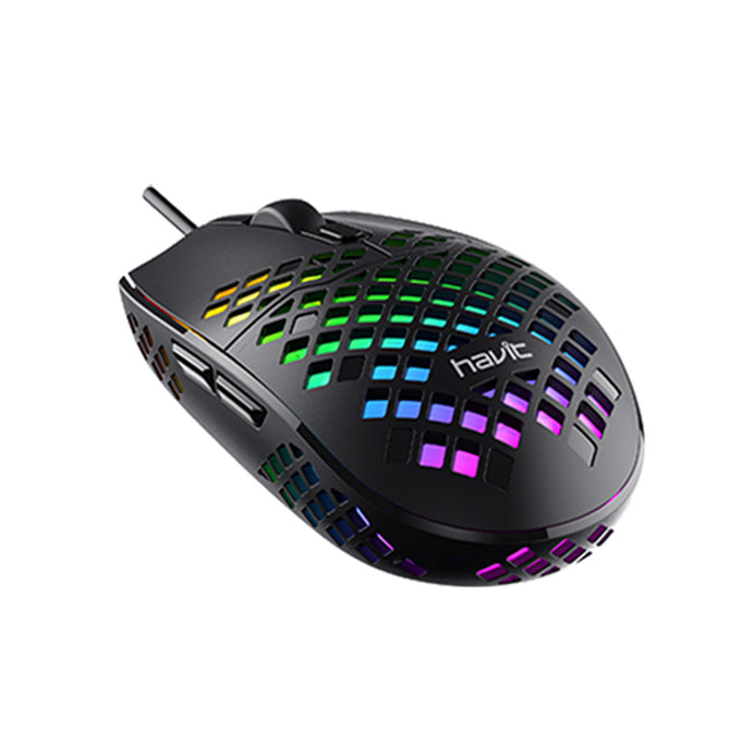 Mouse Gamer Havit MS1008. Con un diseño en su estructura que se asemeja a un panal de abejas, lo que le otorga la característica de ser más liviano y asi evitar el cansancio si lo utilizamos por largos periodos.