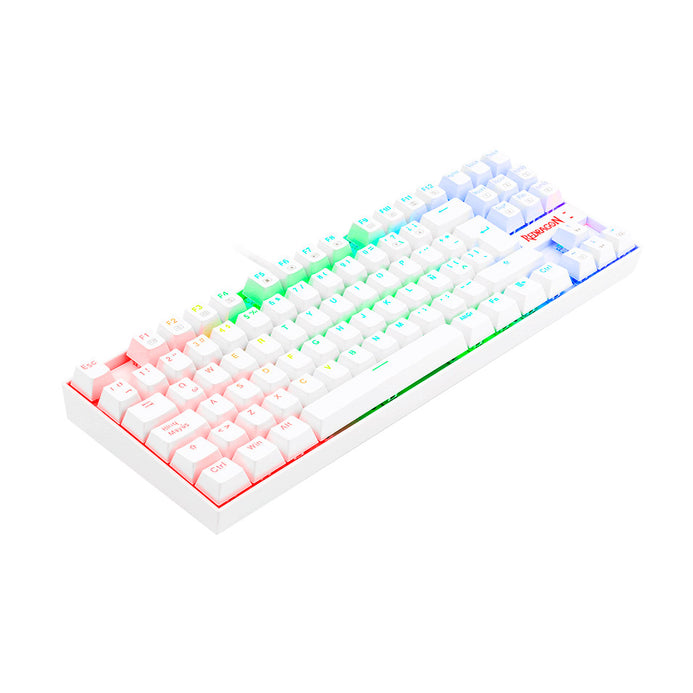 Teclado mecánico REDRAGON KUMARA K552W-RGB-SP, color blanco para darle estilo a tu Set Up gaming, posee iluminación RGB que te permite identificar los comandos de tu teclado, aun con poca iluminación exterior.