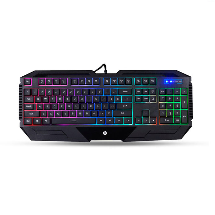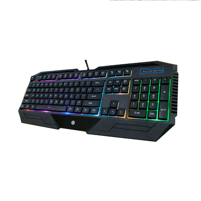 Teclado gamer HP K110  con teclado numérico e iluminación Led . Su diseño con reposamuñecas en la parte inferior y patas ajustables te otorga mayor comodidad para tus sesiones gaming.
